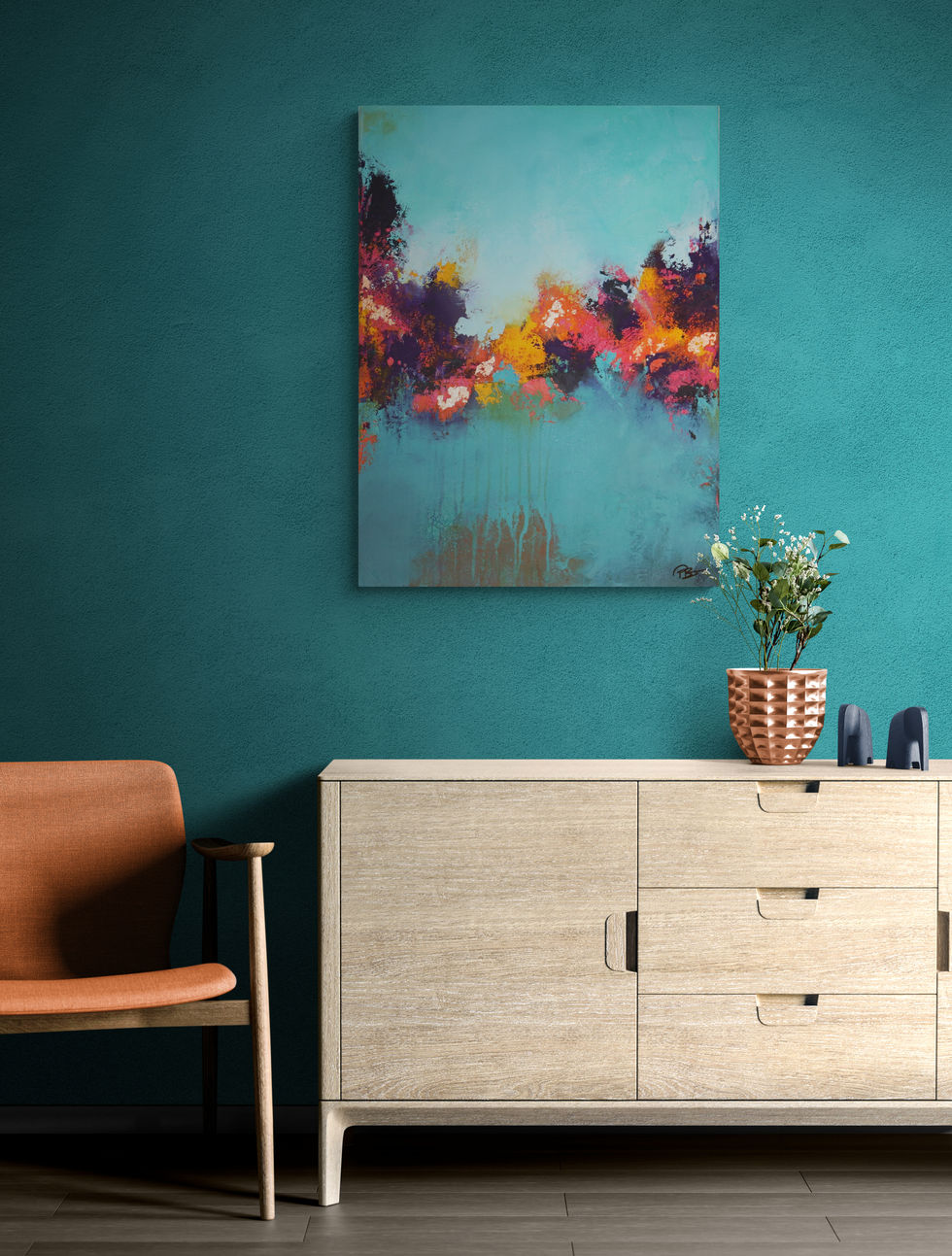 Dieses Bild ist eine Hommage an die Lebensfreude. Es zeigt, wie man das Leben in vollen Zügen genießen kann, indem man sich selbst und die Welt um sich herum schätzt. Die blaue Farbe steht für die Ruhe und Harmonie, die man in sich selbst findet. Die bunte ausschweifende und unregelmäßige Linie steht für die Vielfalt und Schönheit des Lebens, die man aktiv erlebt und nicht nur passiv beobachtet. Das Gold steht für den Wert und Glanz, den man in sich selbst und in anderen entdeckt. Das Bild zeigt, dass Lebensfreude aus der Harmonie zwischen sich selbst und der Welt entsteht. Es hat eine starke Ausstrahlung und eine positive Botschaft. Es fordert den Betrachter auf, sich mit seinen eigenen Gefühlen und Wünschen zu beschäftigen. Es zeigt, dass man Lebensfreude nicht nur von außen erhält, sondern auch von innen erschafft. Es ermutigt den Betrachter, seine eigene Farbe zu finden und zu zeigen. Dieses Bild ist ein Ausdruck von Kreativität, Freiheit und Harmonie.